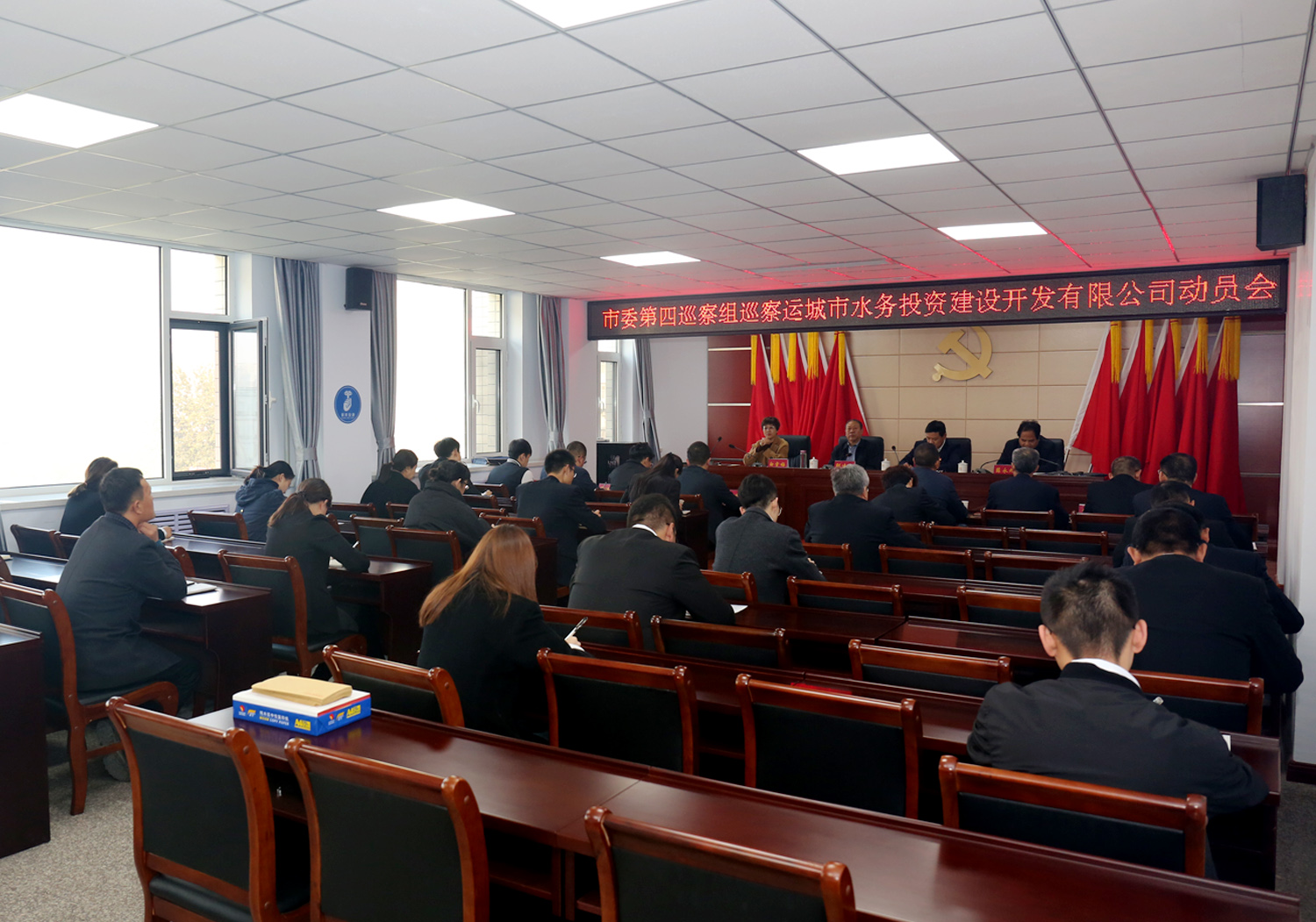 11月5日上午,市委第四巡察組進(jìn)駐我公司召開(kāi)動(dòng)員大會(huì),市委巡察辦副主任邵建設(shè),市委巡察第四組組長(zhǎng)薛永旭、副組長(zhǎng)白雪梅,市委巡察辦巡察三科科長(zhǎng)田玉軒及巡察組全體成員,駐市工信局紀(jì)檢監(jiān)察組正科級(jí)紀(jì)檢監(jiān)察員馮偉一行7人到會(huì)指導(dǎo)。公司黨委班子成員,全體員工和三個(gè)下屬單位主要負(fù)責(zé)同志,共計(jì)28人參加會(huì)議。會(huì)議由公司黨委書(shū)記崔作銘同志主持。
