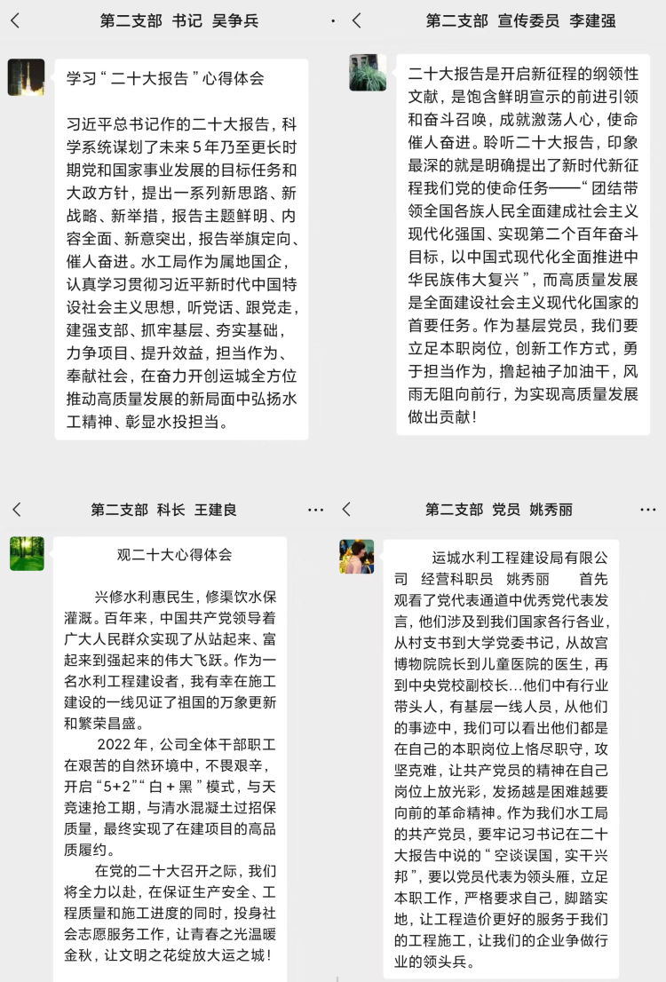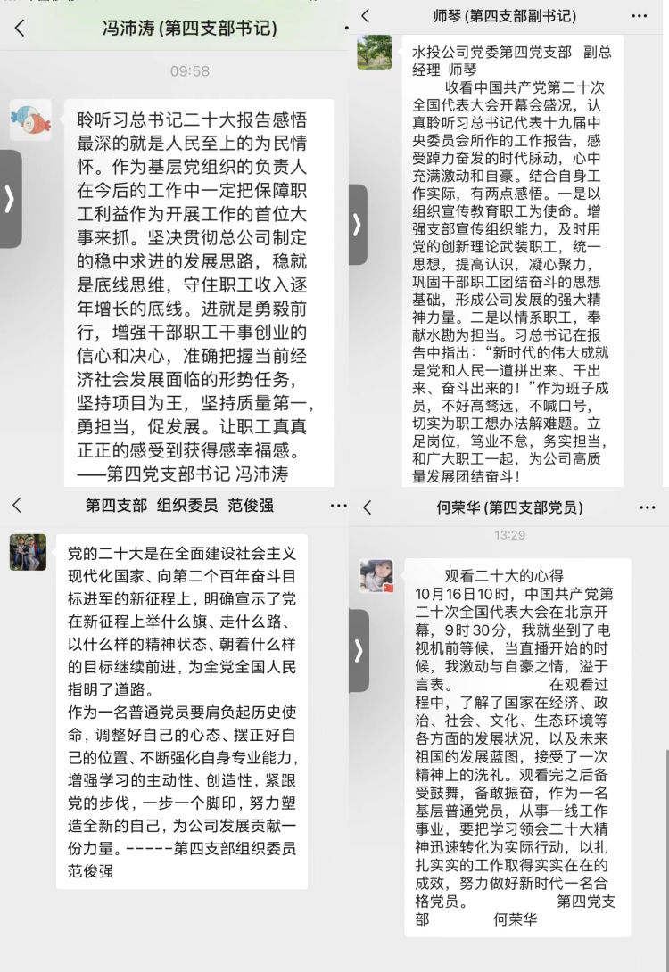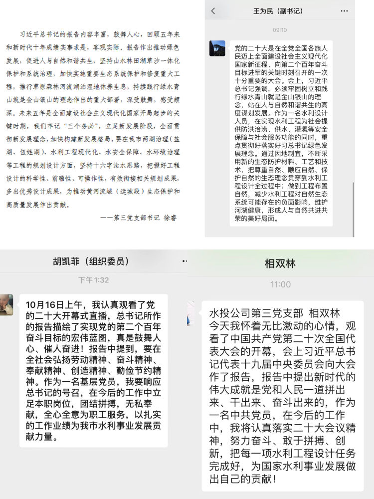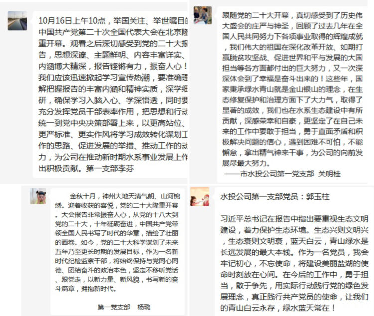 習近平總書記的報告中指明了生態(tài)文明建設的重要意義,特別強調了要“推動綠色發(fā)展,促進人與自然和諧共生”,令人振奮、催人奮進,大家紛紛感言,要把黨的二十大精神作為當前和今后一項重要政治任務,要學以致用,立足本職崗位,突出工作重點,用黨的二十大精神指導實踐,做好中心城區(qū)重點水系項目推進工作,推進黑臭水體治理,強化水質提升,解決城區(qū)排澇問題,把黨的二十大精神轉化為推進公司發(fā)展的強大動力和生動實踐,努力在新時代新征程上展現新氣象新作為。
